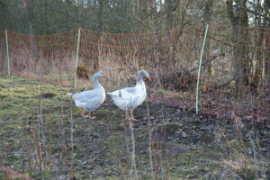 Das würdevolle Paar „Bayerische Landgänse“ grast unter den Bäumen und kündigt lauthals und unbestechlich jeden Besucher an.